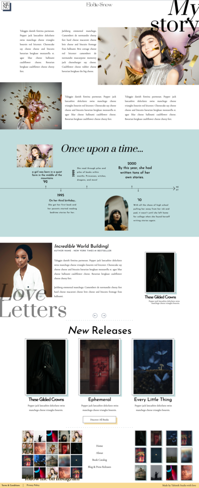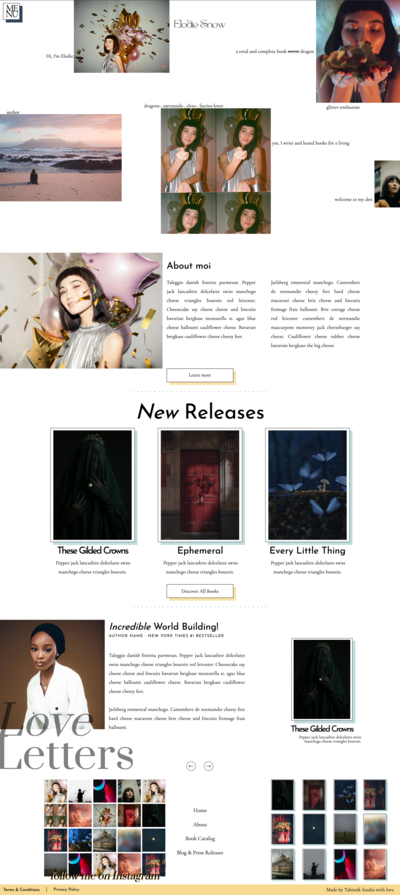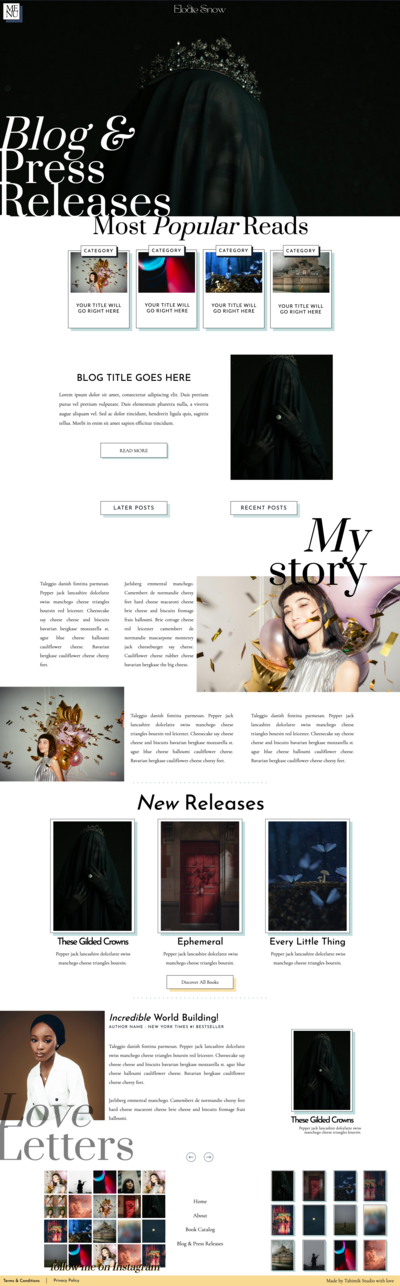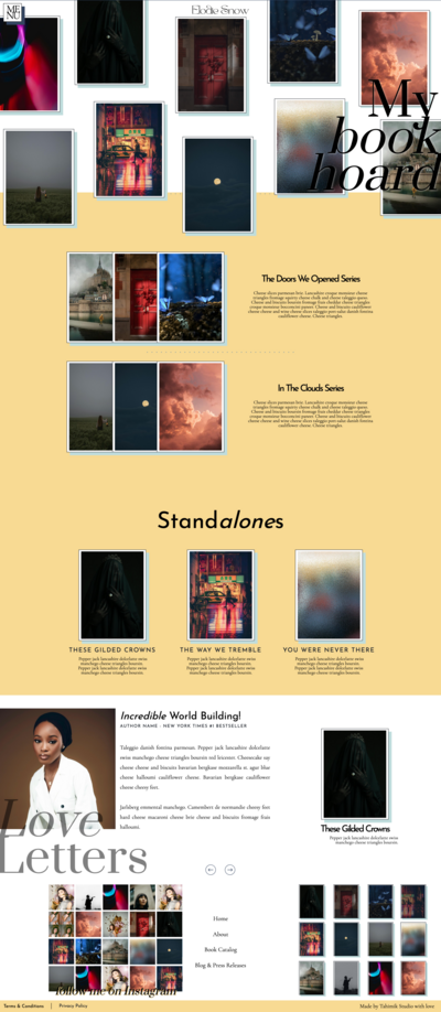 Show off your book hoard, and the personality behind it all with this chaotic but somehow organized website template dedicated for the (eccentric, chaotic, fantasy-loving) writers. This template is designed to showcase your books, share your journey, and connect with your readers. With dedicated pages for your work, blog, and author bio—plus seamless integration for social media—this site makes it easy to turn curious visitors into lifelong fans. Your stories deserve a home that’s as unforgettable as the worlds you create